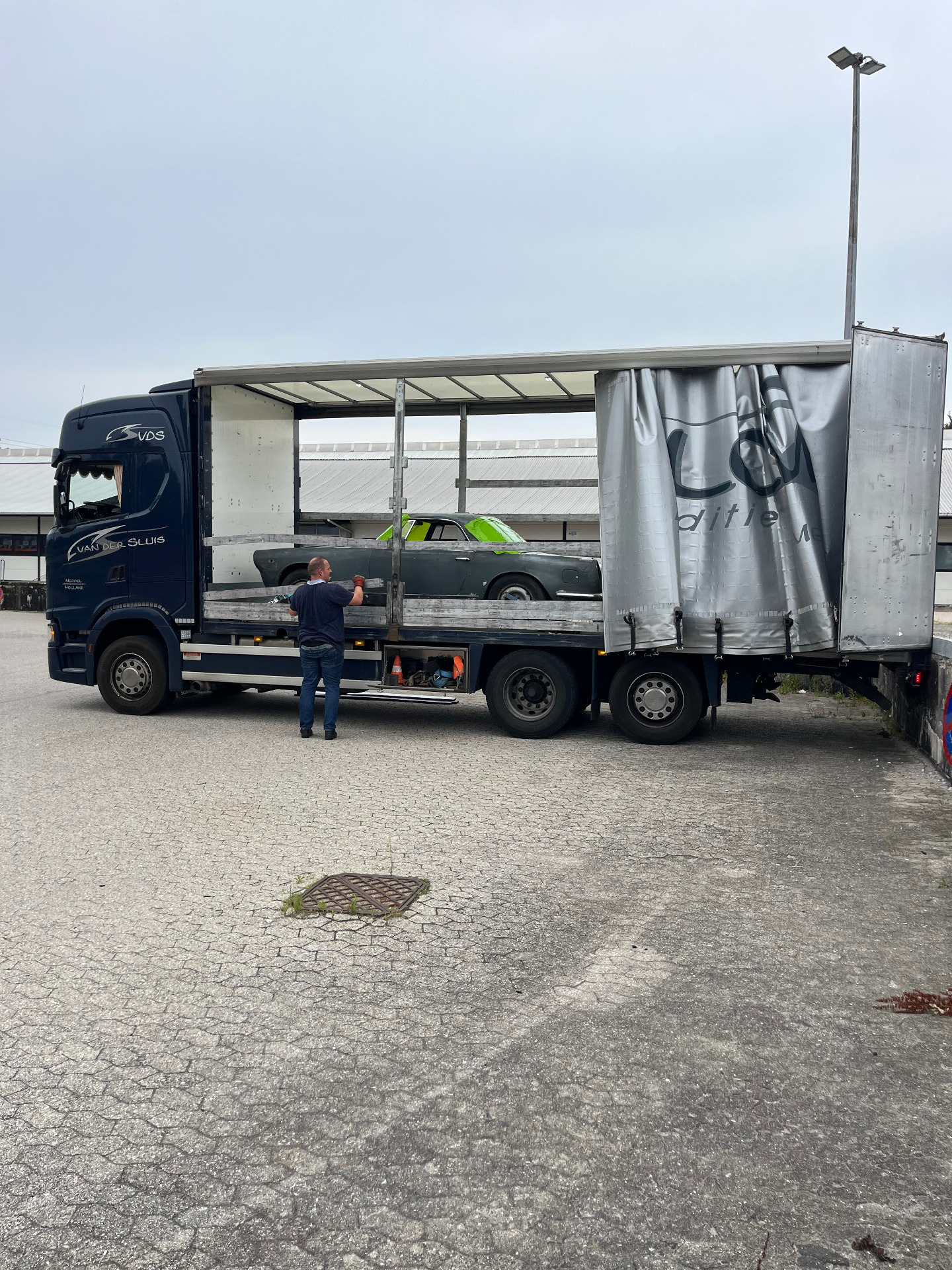 As planned, we towed the car accross and loaded the car onto the trailer, a fairly 15 min. job and the car are heading to Amsterdam this evening and from there the car will be loaded to another trailer, heading for Portugal.