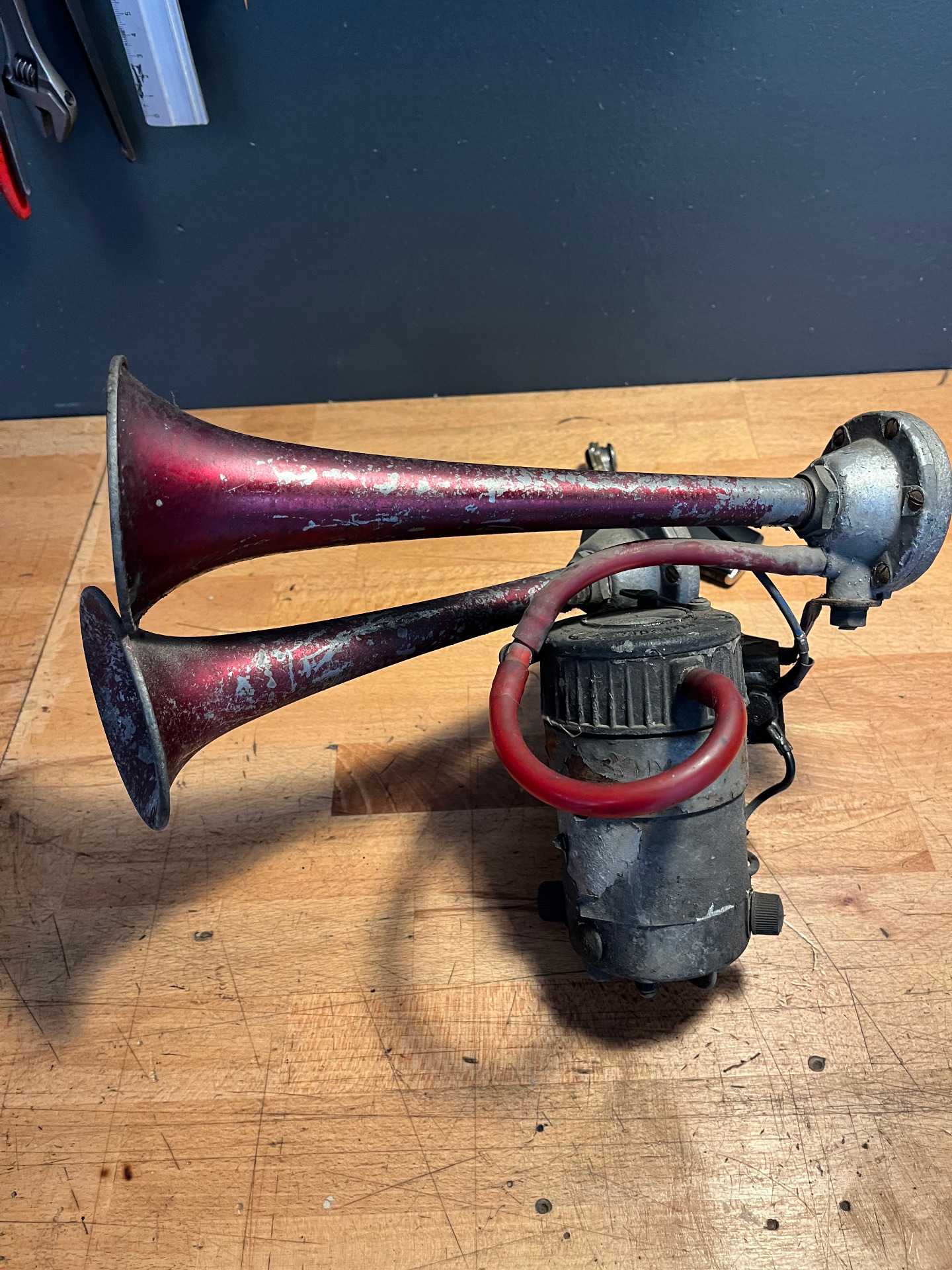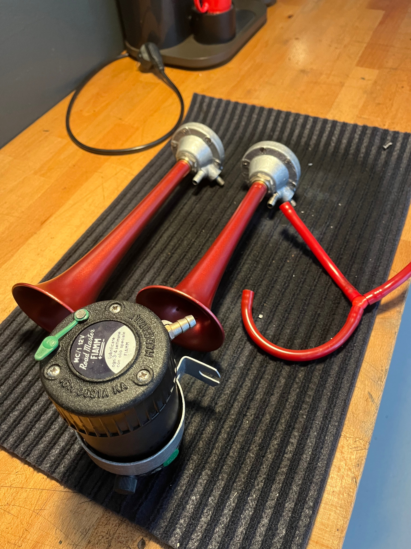 The Fiamm Roadmaster compressor horns where another story, allways been a huge fan of those early aluminum horns, with there deep red color and the compressor with the black wrinkle paint on top of the cylinderhead.